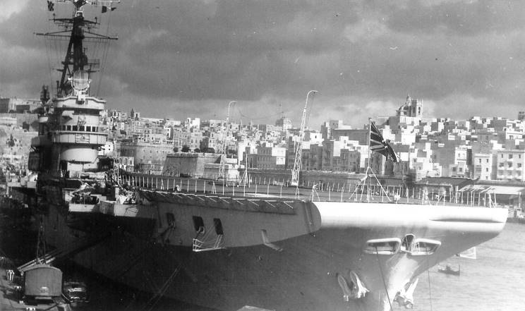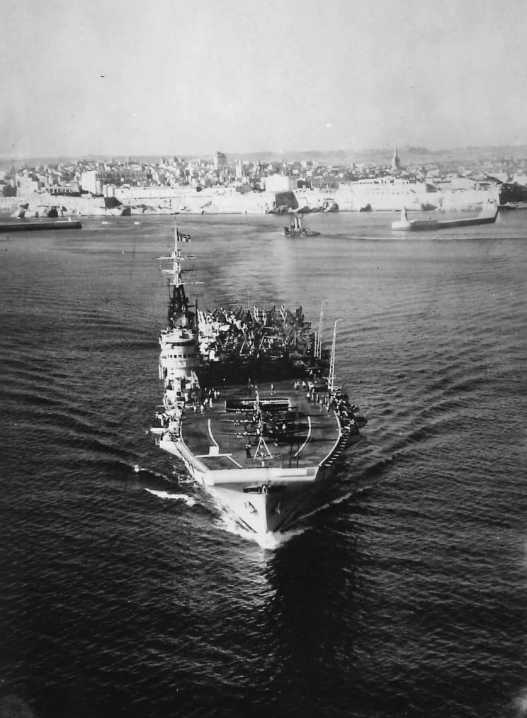 1953: HMS Theseus seen departing the Grand Harbour, Malta flying the H.R.H. Duke of Edinburgh standard. |