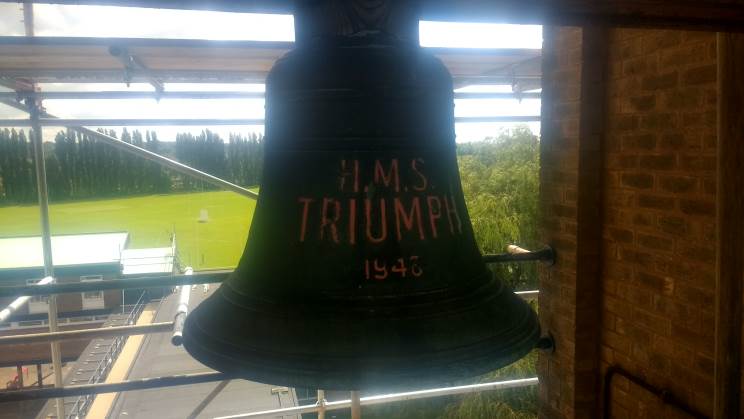 4. Sept. 3, 2017 I hope this may enlighten the where about of the HMS Triumph bell. I was recently scaffolding a bell tower at Queen Mary's grammar school at Walsall and came across the bell in the tower. Thanks, Shaun Mooney |