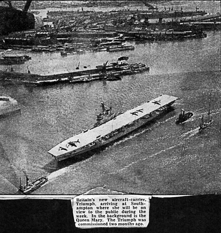 Newspaper article showing HMS Triumph arriving at Southampton, England. |