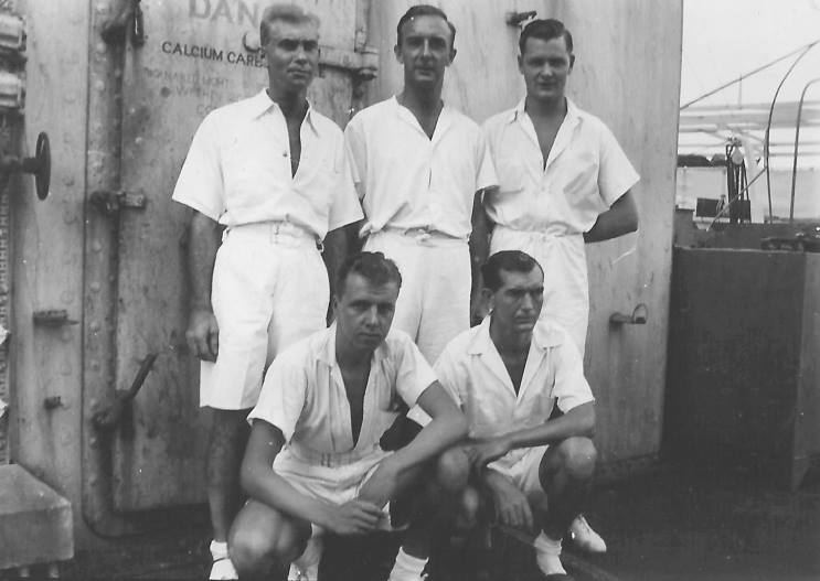 Kenneth Charles Collings (standing middle) and four unidentified crewmen seen on HMS Hecla. |