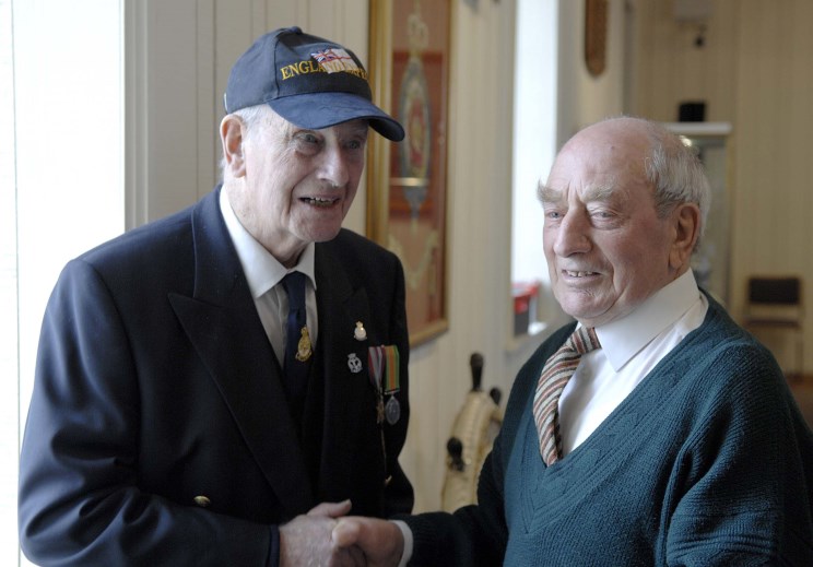 April 14, 2010: George Male (left) survivor of HMS Hecla seen shaking hands with Harry Haddon, one of the crewmen of HMS Venomous D-75 which rescued him and hundreds of others after Hecla was torpedoed seen at the National Museum of the Royal Navy during the launch of the book A Hard Fought Ship: The Story of HMS Venomous. |
