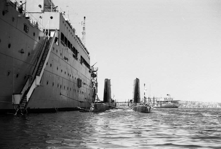 HMS Maidstone A-185 with two unidentified submarines alongside. |