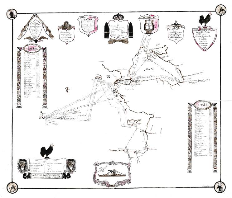 A hand drawn map by Able Seaman W. Mityifie, R.N. of the movements of HMS Ajax during 1920-1921.