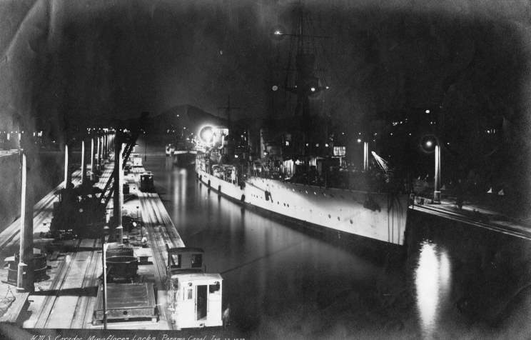 January 22, 1929: HMS Caradoc seen in the Miraflores Locks, Panama Canal. |