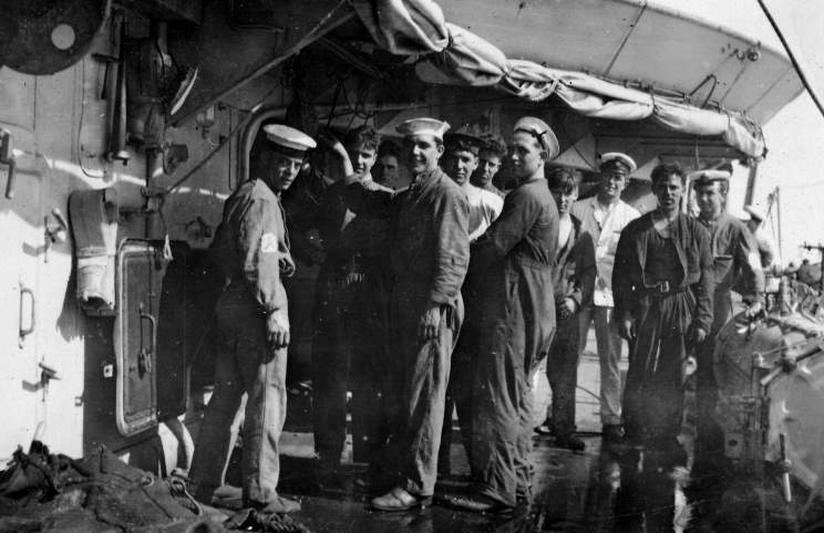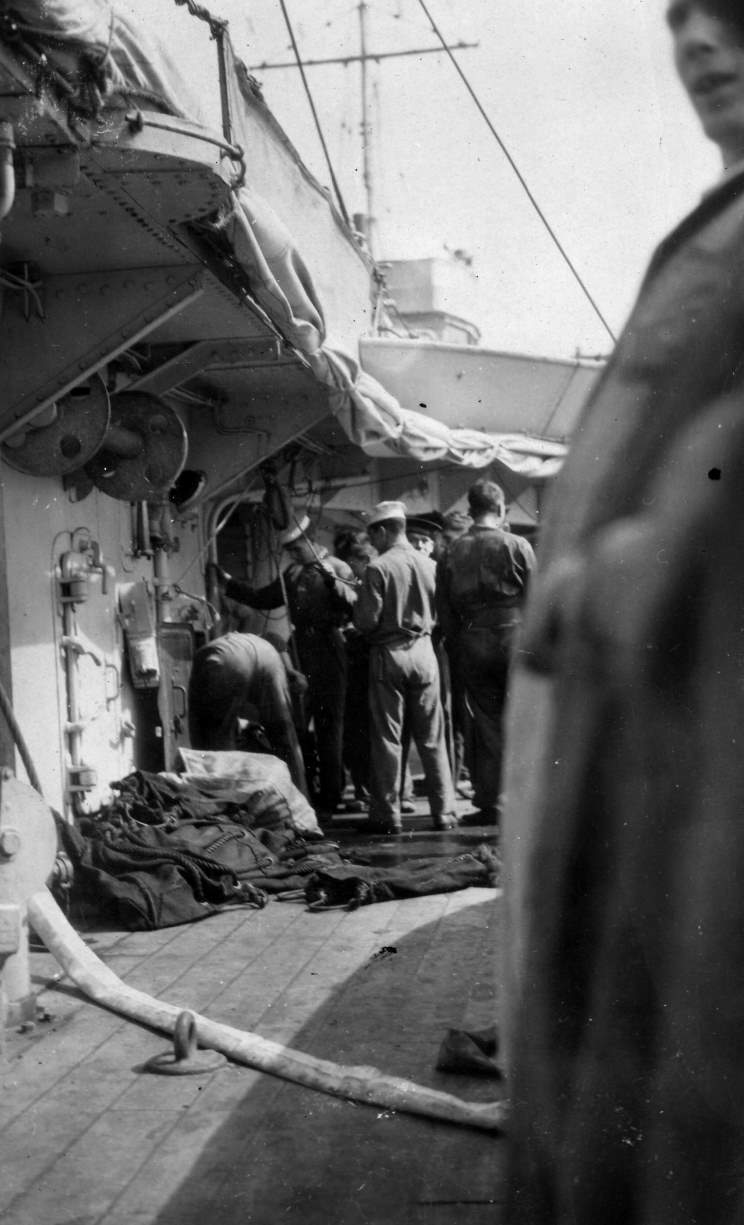Crewmen cleaning up HMS Caradoc after a coal bunker fire. Wilfred R. Butler is seen second from left. |