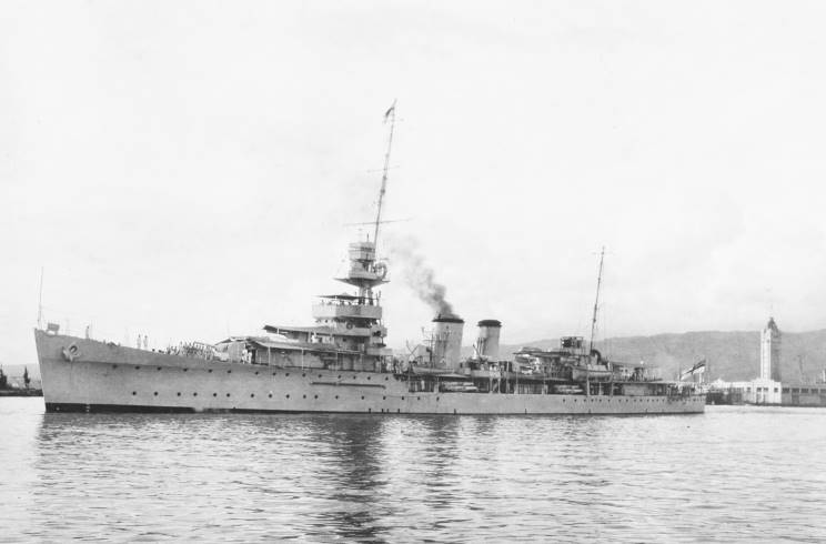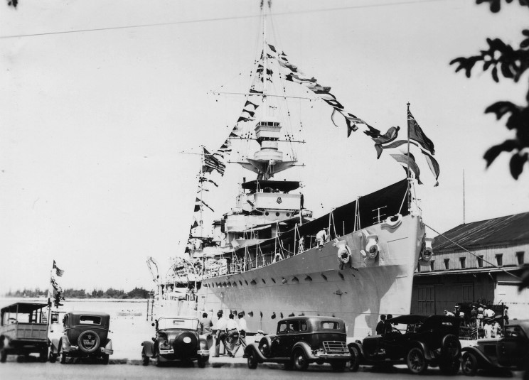HMS Dunedin seen in Hawaii in the 1930's. The Aloha Tower is seen in the background.
