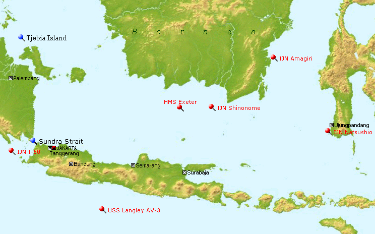 Sunk Mar. 1, 1942 by Japanese cruisers Nachi, Haguro, Ashigara, Myoko and destroyers Akebono, Inazuma, Yamakaze, Kawakaze, Ikazuchi in the Battle off Bawean Island. Location: Java Sea 90 miles north of Bawean Island, Indonesia. (04.25S - 112.32E) 54 crewmen killed, 651 picked up by Japanese ships and remained POW's for the remainder of the war, many of them died in Japanese POW camps. (Roll of Honour) |