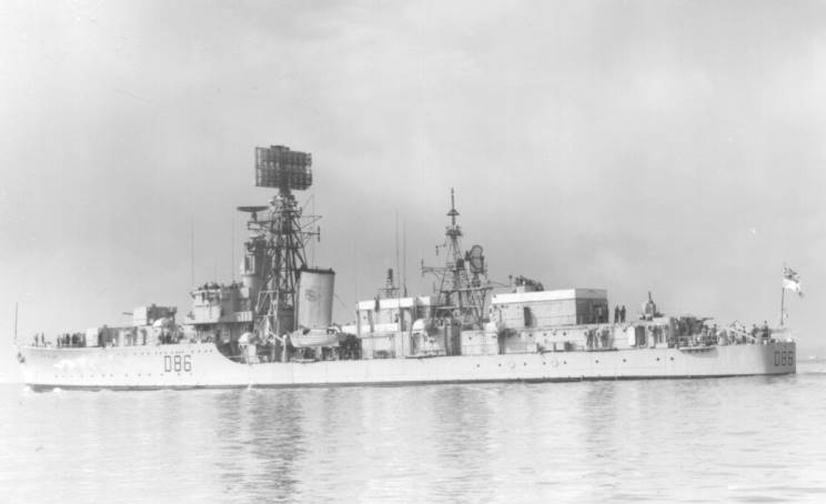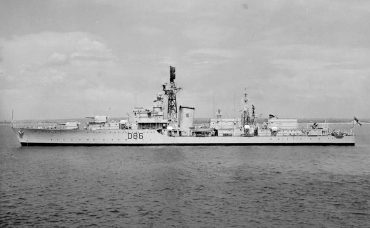 HMS Agincourt D-86 seen after conversion to a radar picket ship in 1959. |