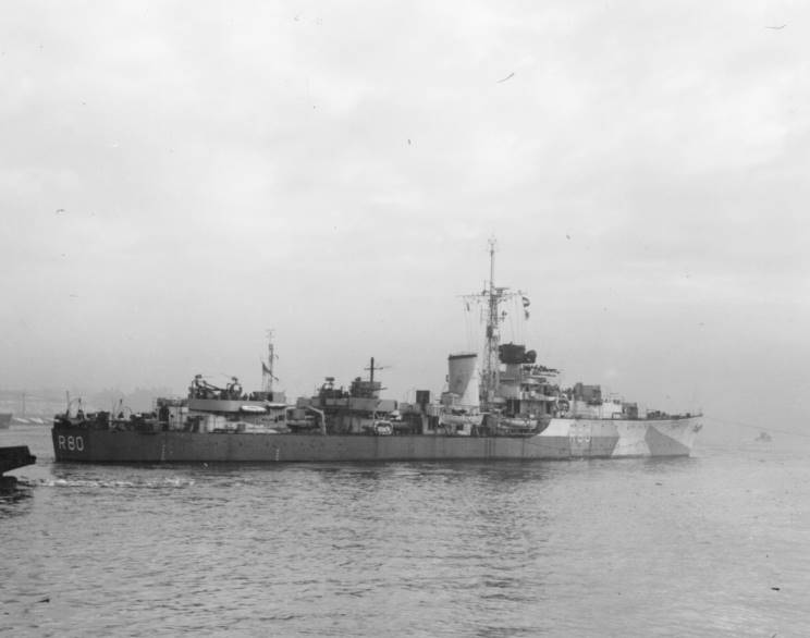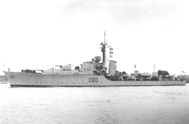 HMS Barfleur D-80, date and location unknown. |