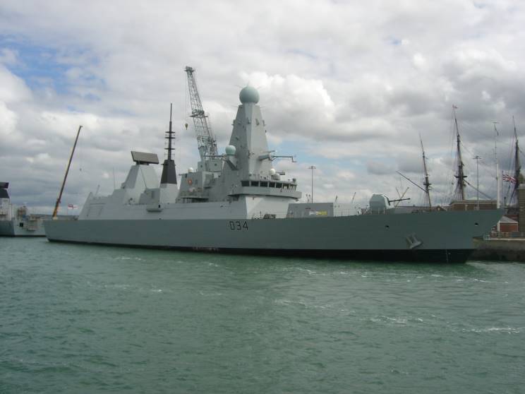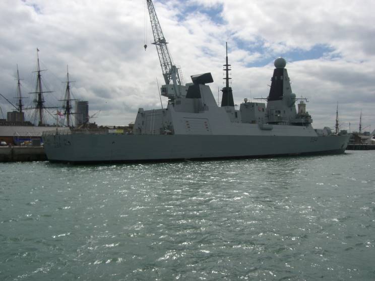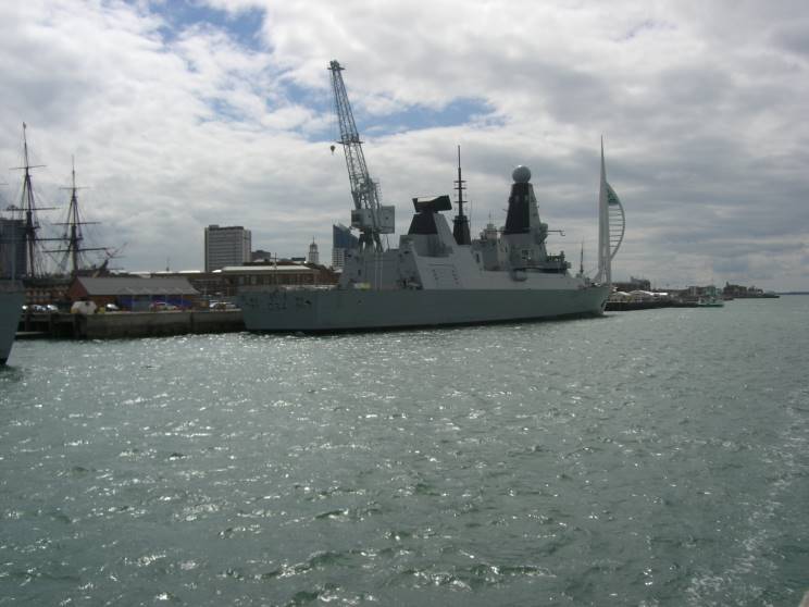 May 27, 2011: HMS Diamond D-34 seen at HM Naval Base Portsmouth. The masts of HMS Victory can be seen at right. |
