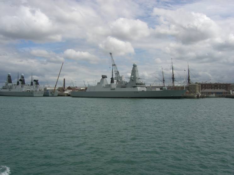 May 27, 2011: HMS Diamond D-34 seen at HM Naval Base Portsmouth. HMS Dauntless D-33 and HMS Daring D-32 are seen astern and the masts of HMS Victory can be seen in the background. |