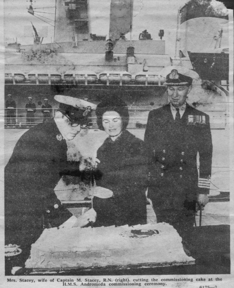 Portsmouth Dockyard's second-to-none record as a builder of warships for the Royal Navy was given a new boost with the commissioning of the 2,300-ton H.M.S. Andromeda. She is the fifth Portsmouth-built frigate to join the fleet since the end of World War II, following the Rhyl, Leopard, Nubian and Cirius, writes the Evening News Naval Correspondent. And she is the 48th ship built in the yard this century, and the 182nd completed since shipbuilding began in the port in 1690. The dockyard has given Andromeda a fine start-she has been built in record time for a Leander class ship. From the time she was laid down to the completion was just 31 months, equalling the speed with which Vickers built Penelope on Tyneside. She overhauled her immediate sister, Hermione, laid down on Clydeside by Alex Stephen's six months before work started on Andromeda, and still not completed. As a result, Andromeda is a class leader, with a full captain in command. All reasons for pride for the builders, represented at the commissioning ceremony by Admiral Superintendent of the Dockyard (Rear Admiral A. J. Power) and the General Manager (Mr. H. Fulthorpe). Main guest at the ceremony was the ship's sponsor, Mrs. Reynolds, who was accompanied by her husband, Mr. Gerry Reynolds, Minister of Defence (Administration). Mrs. Reynolds, who launched the ship in May, 1967, presented Andromeda's Commanding Officer, Captain Michael Stacey, R.N., with a silver salver marking the occasion. Another gift was a bible presented by T.S. Andromeda, a Sea Cadet Corps unit at Stevenage, which has formed a link with the frigate. Captain Stacey told guests that Andromeda would be joining the Western Fleet after sea trials at Portland. The frigate was due to sail for East of Suez in late summer, returning in the mid-1970's. The commissioning ceremony was conducted by the Chaplain of the Dockyard (the Rev. Kenneth Evans, R.N.), assisted by Church of Scotland and Roman Catholic naval chaplains. |