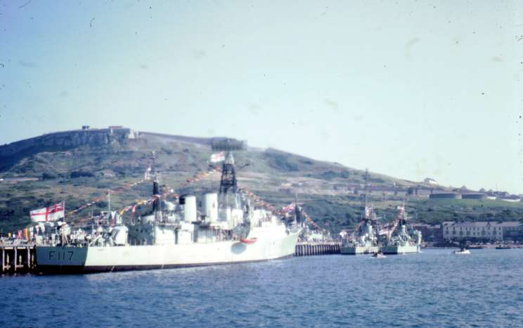 August 1964: This never before published photo shows HMS Ashanti F-117, HMS Pellew F-62 and HMS Dundas F-48 at Portland, England perhaps during Navy Days. |