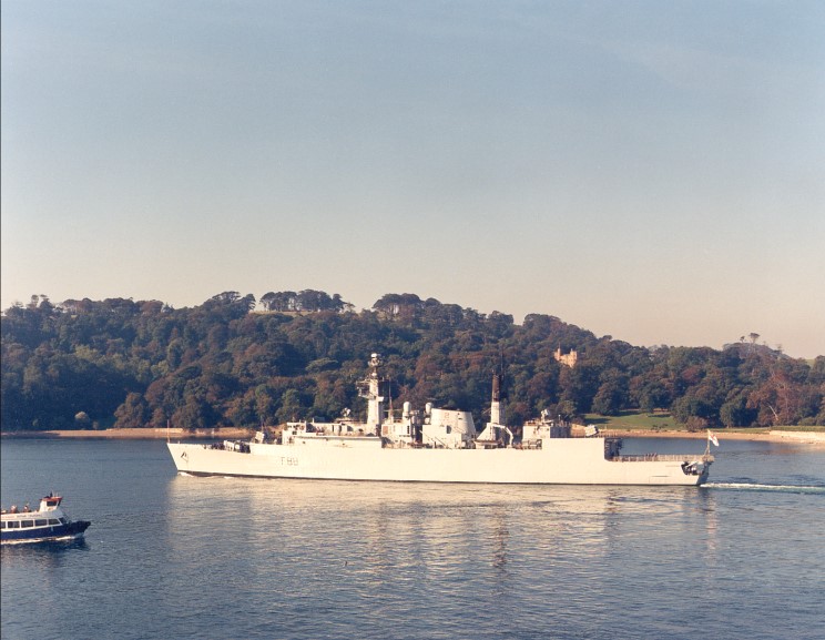 HMS Broadsword F-88 seen departing from Devonport in 1989.