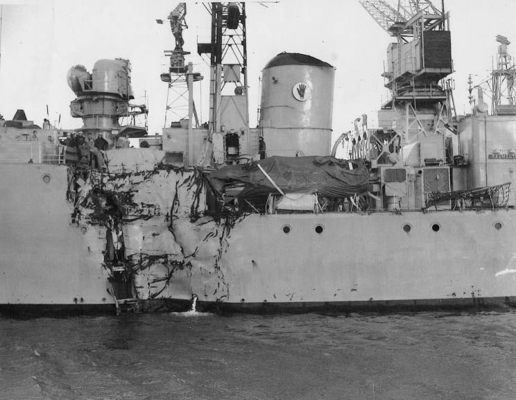 As soon as the gangways were in position I went ashore for the first time and walked forward to the damaged area. The hull was open to the sea below the waterline to the bilge keel and the compartments in the area exposed, the heavy riveted deck plating at the point of impact was pushed up but had not split, in contrast, the welded seams on the ship's side plating appeared to have torn. Whilst sorting out some of the wreckage on the port wing of the bridge I noticed the remains of the Captain's refrigerator just a few inches wide and wedged in the remains of the pantry of his sea cabin. The sequel to the collision between Falmouth and Tideflow was an enquiry and a Naval Court Martial. The officers attending the Court Martial were the Captain, the navigating officer and the two watch Officers, one on the bridge, the other in the operations room at the time of the collision. All but the Officer of the Watch in the operations room were effectively exonerated from blame, although the Captain was reprimanded. The evidence showed that the RFA entered the ground wave of Falmouth's radar, but despite wave clutter, was accurately tracked by Falmouth's radar plotters, but the operations room watch officer inexplicably chose to ignore the report despite repeated warnings of the closing tanker. It was established that the RFA hit the ship immediately abreast the bridge, but at the moment of the collision, the engines of the RFA were in the full astern position. With great presence of mind, the Officer of the Watch on the bridge ordered full port wheel and Falmouth pivoted on the bows of the tanker. The tanker dropped astern before disappearing into the heavy seas. The President of the Court recommended that the Bridge Officer be awarded a commendation for his presence of mind and great seamanship in avoiding a potentially catastrophic loss of the ship. The damage to Falmouth was very serious and resulted in a major dockyard repair, the split had passed below the bilge keel and the area had been flooded to the waterline. The upper deck was badly distorted and side plating was disrupted over a large area, other superstructure was badly damaged. When the under water repair work had been completed, the dock was prepared for flooding, I recall the event very clearly. During the course of the repair work, large amounts of material was removed which would normally have been carefully weighed and position noted to ensure that compensation could be made to maintain the ship in trim when the dock was flooded. This clearly was not the case because the ship rolled most violently to port at the instant she lifted clear of the keel blocks as the dock flooded. I was in the one of the auxiliary machinery control compartments at the time and had just reached for the remote control for a motor-generator set, when the ship rolled, I lost my balance and slid to the port side of the compartment. There followed, a series of crashes and bangs overhead, my immediate reaction was that I had been electrocuted, but soon realised that the ship was listing very heavily to port. I picked myself up from the deck and quickly made my way onto the upper-deck, where once again, peace reigned. The noises that I heard had been caused by large drums of cable on the foc'sle, rolling to the guard rail, over the top and into the dock , the brow had gone, fallen into the dock with lots of other loose bits of gear. The mast and funnel were just clear of the dock side, debris floated on the surface of the water, a crowd had gathered on the dockside. The rest of the day was spent bringing the ship upright and onto an even keel by counter flooding redressing the imbalance of top weight. I left Falmouth before she re-commissioned, but I understand that all was successful and she completed her training period and joined the Fleet. I have reflected upon the events of December 5/6th 1961. It was clear that nobody could have survived had the ship gone down, the seas were so enormous no boats could have been launched and ship's company taken off by our escorts. At the time I did not think of such things, the ship appeared to me to be stable and upright it was certainly still afloat, the fact that we got underway afterwards, was an indicator that things were not too bad. I remember the rest of that awful night, I spent most of it at the telephone console on the bridge and witnessed the slow and cautious passage back to Portland and the security of the harbour. The night was not without humour. At one point, a young seaman working in the galley came up from below with a fanny of hot soup for us, he tripped over the hatch coaming as the ship rolled very violently and suddenly. He and the soup went flying across the deck. He stood up, said "f--k" picked up the fanny, slithered cross the deck and disappeared, to re-appear a few minutes later with some more soup. The Captain had sat in his "high chair" for the whole time until the ship entered Portland Harbour and he rang down "Finish with main engines". One could imagine what thoughts must have been going through his mind, a brand new ship, now in the most precarious position, filthy with fuel oil and an enormous split in her side. He must have felt as if his world had come to an end. I recall his telling me when I first joined the ship "I expect my senior staff to give of their utmost" We certainly did that. As it turned out, Commander McDonald ended his career as a Rear Admiral. |