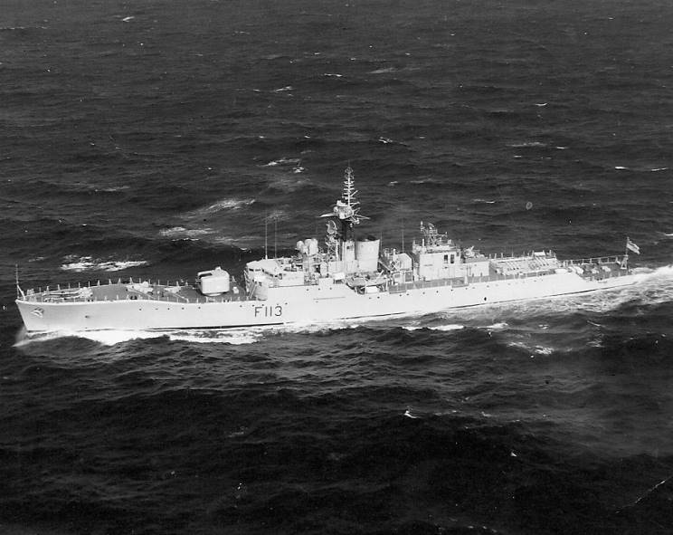On board HMS Falmouth, the ship's company was becoming more familiar with the ship as each day passed. Working from Portland, we put to sea each morning early and throughout the whole day both ship and men were subjected to the most thorough of training schedules, controlled by the onboard FOST (Flag Officer Sea Training) team from Portland. Before dawn each morning, special sea duty-men closed up, the ship slipped her moorings alongside the harbour wall and headed out into the English Channel. Of all the many experiences on that ship, that is one which remains vivid, my special sea duty was on the bridge whenever entering or leaving harbour and thus I was able to take in all that went on. I would take up my position at the rear of the bridge just inside the port wing and adjacent to a telephone console, primarily connected to sound powered telephones from various parts of the ship. The weather in December is invariable rough and the ship began to pitch very violently as soon as we left the shelter of the harbour, when she was clear of the harbour and well established on course, special sea duty-men were stood down and the normal sea watch took over, the hands were piped to breakfast. The FOST exercises appeared to go well during the day, later, the wind increased in strength, heavy clouds moved quickly across the sky and sea state increased. December evenings are not good any where particularly at sea, the 5th of December 1961 was not an exception. Falmouth had moved up Channel to the west to join a convoy of other vessels in a war exercise out into the Atlantic. As darkness fell, the convoy formed up, watch-keepers straining to see nearby ships through the rain each endeavoured to keep position, heavy seas broke over the foc'sle. Onboard Falmouth supper had been served to those who could hold it down and the ship settled into the evening watch. The ship was closed up to damage control state A1 the highest state of readiness, in two watches one below turned in or resting the other closed up on their respective stations, guns, A/S Mortars, ASDICS and plotters. AT 2200hrs, the ship closed onto the large fleet oiler Tideflow to take on oil fuel, we came up astern and established position 100 feet or so on her starboard side; heavy seas pouring down between two ships close together tends to draw them together, station keeping is imperative and hands are closed up in the steering gear compartments to maintain position in the event of a remote steering failure from the bridge. Special sea duty-men closed up and the large derrick supporting the oil fuel hose reached out from the tanker, on Falmouth the hose was hauled across and brought into line with the upper deck down riser to the fuel oil tanks and secured. Pumps on the tanker then started the oil fuel transfer. With great skill the watch-keeping Officers on both ships maintained position, calling out a constant stream of orders to their respective quartermasters on the wheel. Within half an hour, the transfer of fuel was completed the hose disconnected and winched back to the tanker, we dropped astern and pulled clear to join the screen again. Onboard Falmouth the ship settled back to her escort role at the edge of the convoy and armament and underwater systems were back on the alert, submarines were involved in the exercise but no sign of them was evident. As the late evening wore on, the weather appeared to noticeably deteriorate, the seas became much steeper and the howling of the wind through the open mast and signal halyards increased, the ship's broadcast announced that storm force winds were to be expected toward midnight, all loose gear was to be lashed down, deadlights secured and access to the upper deck was prohibited. In Falmouth's operations room, the air warning systems expected nothing in the steadily worsening conditions and they stood down. The radar watch-keepers staring into their screens could make out very little immediately around the ship. Wave clutter was out to at least a mile although all the ships in company were painted quite clearly sometimes missing a "paint" as the seas steadily increased in size and the ships disappeared from the radar's scan into a trough. On Falmouth, the lookouts on the wings of the bridge were brought into the enclosed bridge and the screen doors secured, the seas were already breaking over the foc'sle and were washing down the upper deck with an enormous roar then up and over the bridge, the window wipers unable to clear the mass of water. At 2330 or so, I left the mess to do rounds of the equipment in my charge, the forward Chief 's mess was well forward on the starboard side immediately abaft the diesel alternator room which itself was immediately below the foc'sle, I could hear the heavy seas hitting the deck above and rushing through the breakwaters either side. The two diesels driving the alternators were thundering away through the closed watertight door as I struggled aft against the violent pitching of the deck beneath my feet. It was possible to walk from forward to the after end of the ship under cover, our predecessors had no such comfort, the exposed upper deck was the only route to engine rooms and boiler rooms across the iron deck. Some weeks before, during early sea trials, I experienced for the first time, the idiosyncrasies of the new ship and for the first time in my naval career, felt very queasy. Seasickness is most debilitating and reduces one's will or indeed ability to do anything to virtually nil. Fortunately for me, a fellow mess member, the ships Cox'n, introduced me to Avomin, given to expectant mothers for morning sickness. This did the trick, one tablet on the evening before an early sailing was sufficient, I slept well, ate a good breakfast and was ready for anything. They never failed to work and during my time on Falmouth I used them before we put to sea. Thus fortified, I started my rounds I stuck my head into the gyro compass room, all was well, a quic