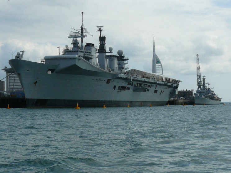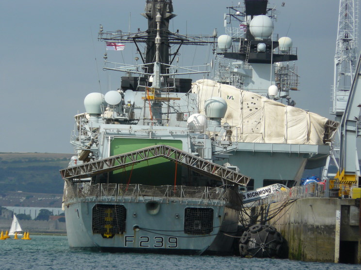 August 17, 2009: HMS Richmond F-239 seen astern of HMS Illustrious R-06 at Portsmouth, England. |