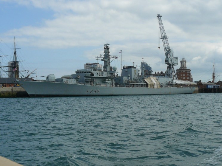 August 17, 2009: HMS Richmond F-239 seen at Portsmouth, England. HMS Victory can be seen in the background. |