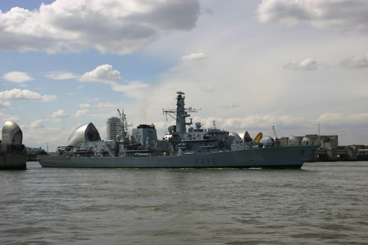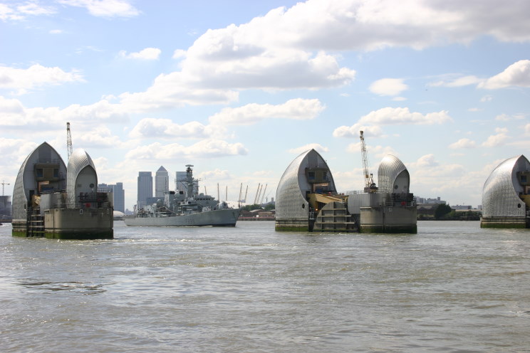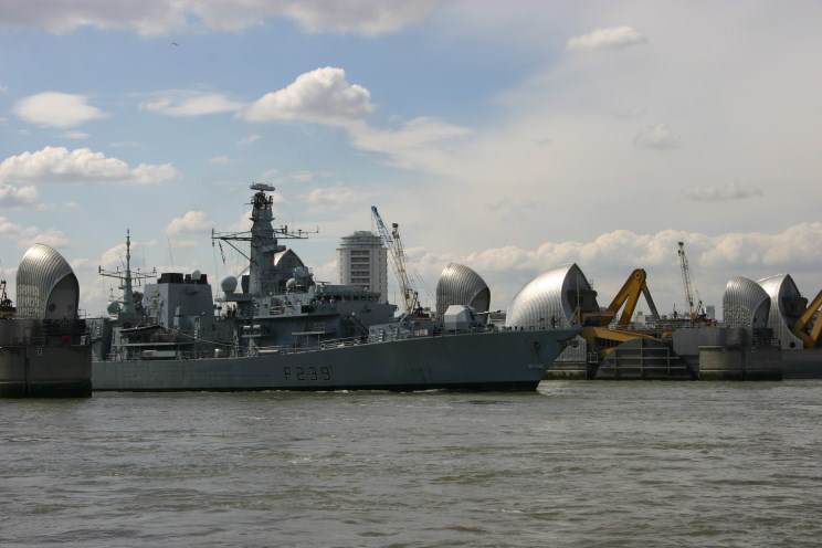July 12, 2010: HMS Richmond F-239 passing through the Thames Barrier. |