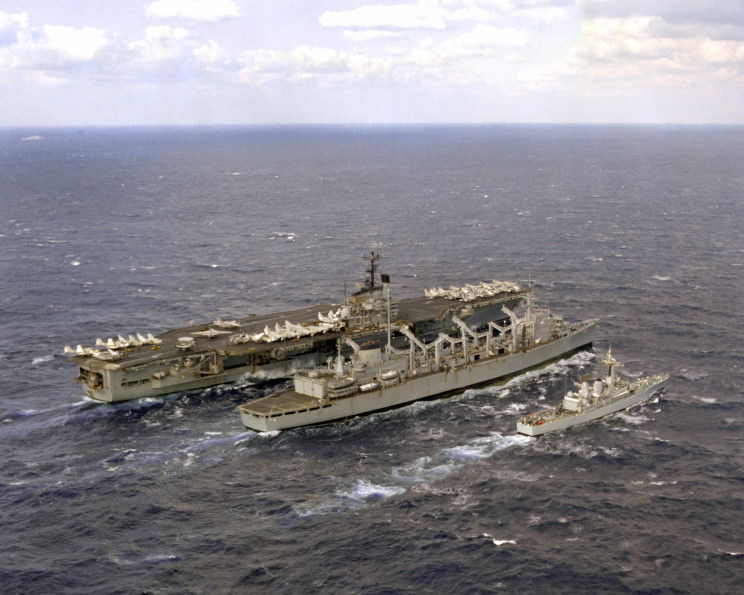 November 18, 1979: HMS Scylla F-71, USS Detroit AOE-4 and USS Independence CV-62 seen during a NATO exercise. |