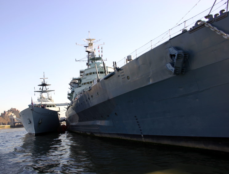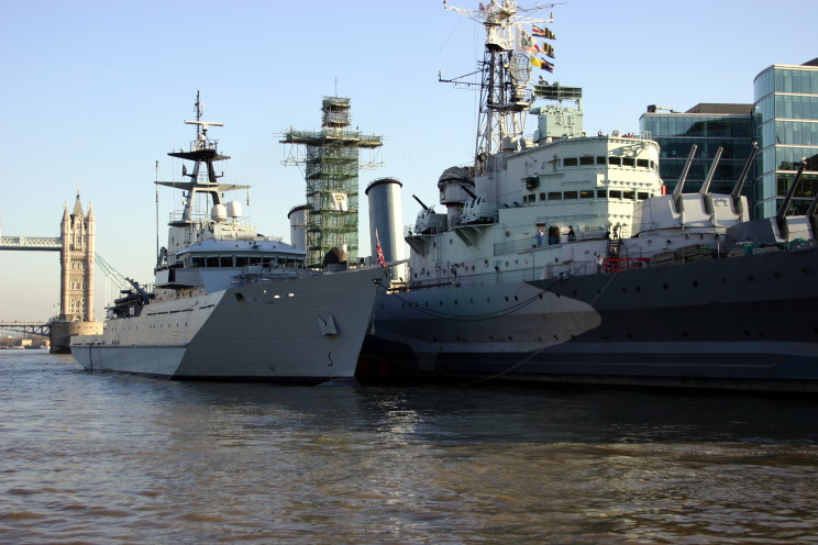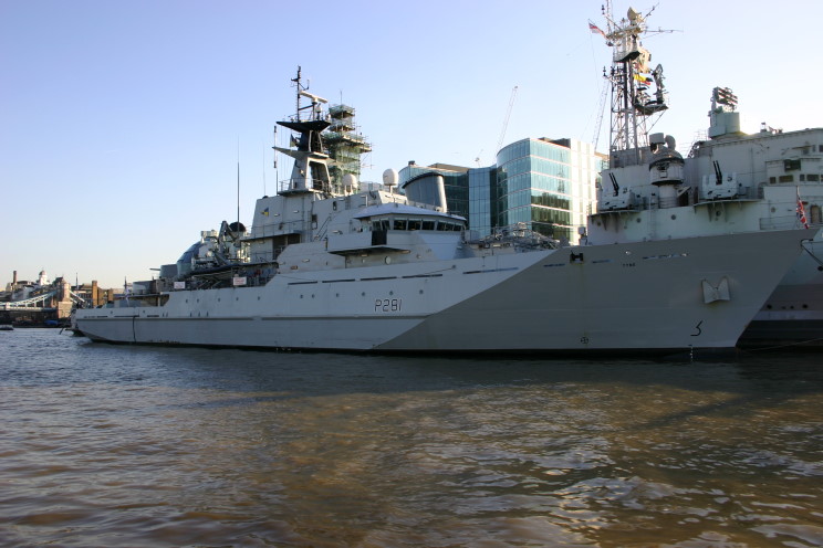February 13, 2008: HMS Tyne P-281 moored alongside HMS Belfast on the Thames River, London, England. |