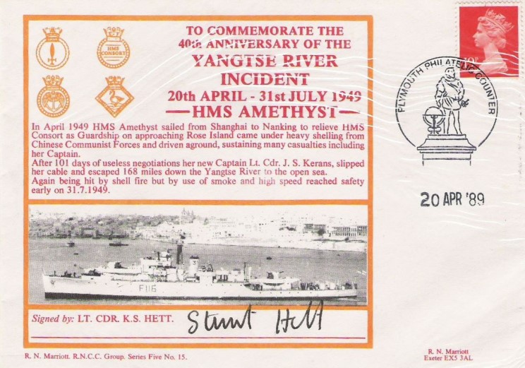 24. Aug. 28, 2009 I am trying to ascertain if Derek Arthur Cook served on HMS Amethyst. I am led to believe by one of his RN friends that Derek joined HMS Ganges in November 1945 and was in the Drake 201 class. Later, in 1948, he is said to have arrived in Shanghai on HMS Amethyst and was one of the ship's company to reach safety overland. When I made his acquaintance in the 1970s' he was employed as a radio operator at the Scarborough Admiralty Wireless Station, later known as CSOS Irton Moor. He never talked about HMS Amethyst but certainly had a lot to say about early days as a boy at HMS Ganges! He did present me with a First Day Cover dated 20th April 1989 commemorating the 40th anniversary of the Yangtze Incident (see below). Your web site carries a Roll of Honour for the crew of HMS Amethyst and they deserve prominence in our thoughts. But I am surprised that I can't find a FULL list of the crew. Surely this must be well documented. Derek A. Cook died here in Scarborough on the 7th March 1999. I attended his funeral. I would be grateful if you could tell me if Derek was on the Amethyst or where I can find a complete list of the ship's crew members. Yours sincerely, Kenneth Carling, Scarborough, England |