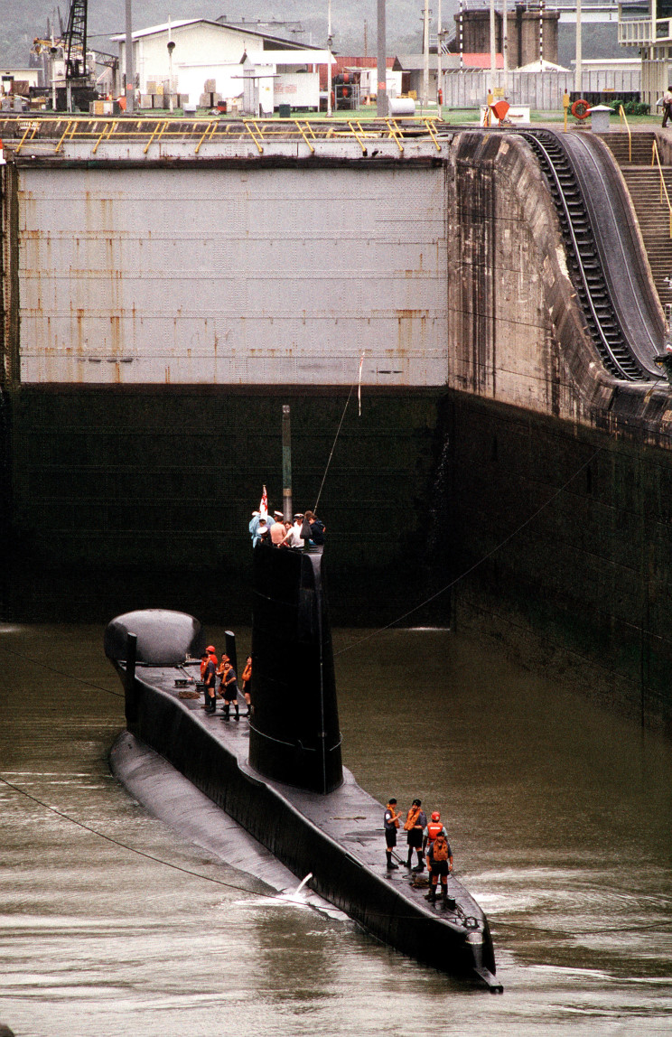 October 1989: HMS Ocelot S-17 in the Miraflores locks, Panama Canal.
