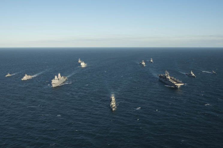 July 16, 2015: U.S., Australian and New Zealand naval ships of Talisman Sabre 2016. HMNZS Te Kaha F-77 is seen second from left. |