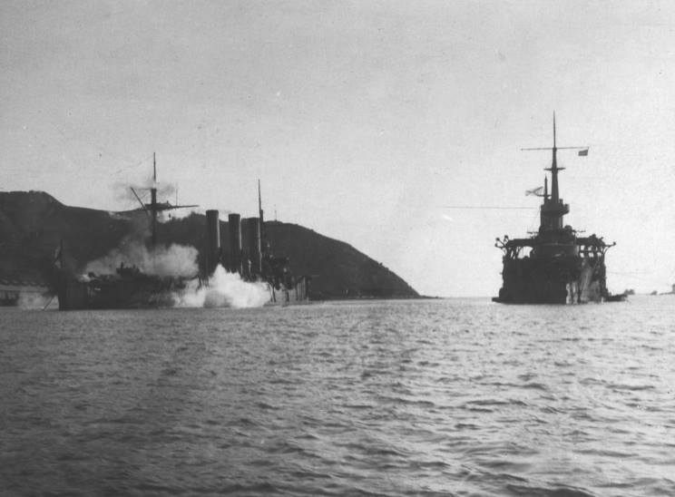 | December 7-9, 1904: Palleda (left) and Pobeda (right) under fire from Japanese shore batteries at Port Arthur (Dalian), Laionig Provence, China. |