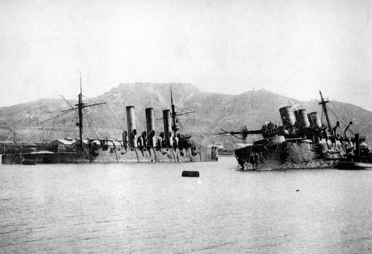 | December 1904: The abandoned Palleda (left) and Pobeda (right) at Port Arthur (Dalian), Laionig Provence, China. |