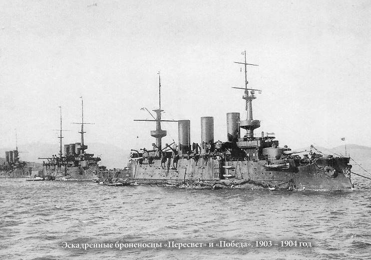 | Postcard showing Persviet (left) and Pobeda (right) with a third unknown ship in the background. Possibly at Port Arthur. |