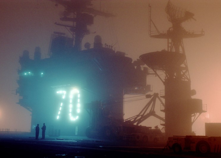 October 24, 2002: USS Carl Vinson CVN-70 seen in an early morning fog before departing on a training exercise. |