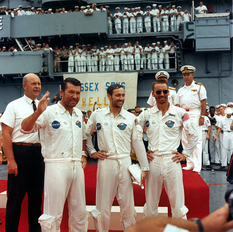 October 22, 1968: Astronauts from Apollo 7 soon after recovery by the USS Essex CV-7. From left to right are; mission commander Walter M. Schirra, Jr., command module pilot Donn F. Eisele and lunar module pilot Ronnie W. Cunningham. |