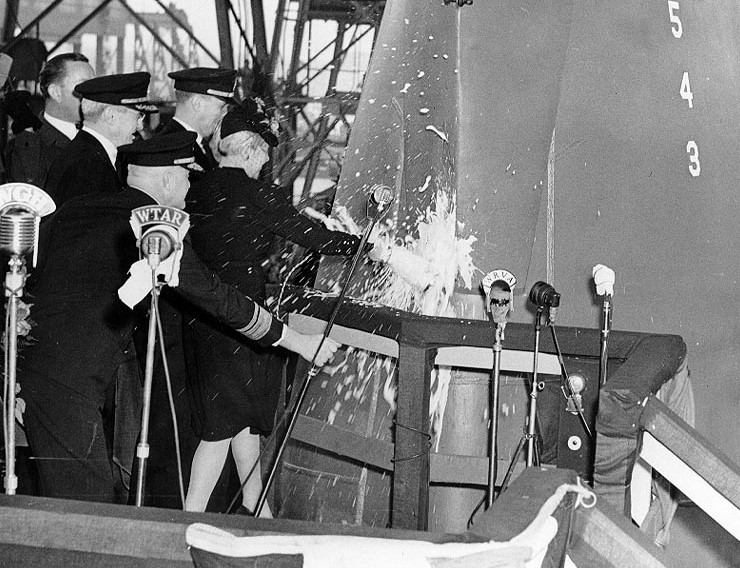 | February 24, 1944: Ship's sponsor Mrs. Josephine Doolittle christens Shangri-La CV-38 during the launch ceremony at the Norfolk Naval shipyard. |