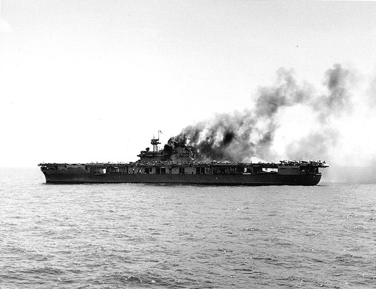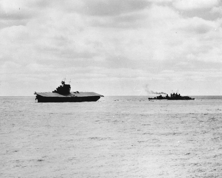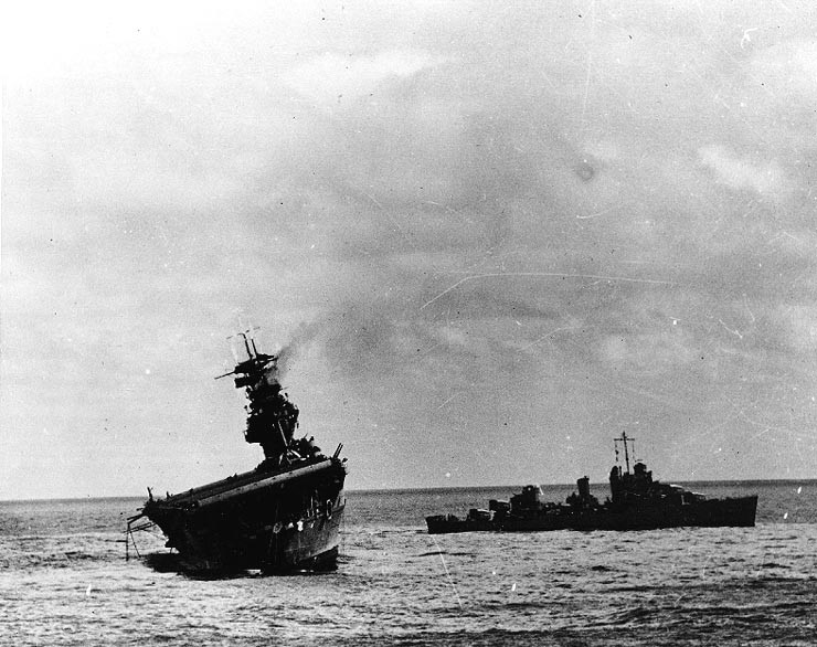 June 4, 1942: The abandoned USS Yorktown CV-5 after the Battle of Midway.