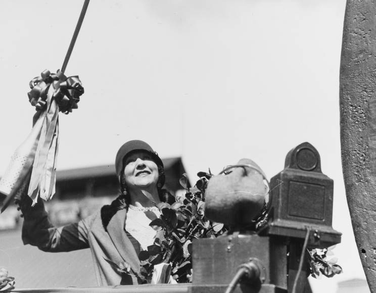 April 10, 1930: Launch ceremony for Chicago CL-29, Miss Elizabeth Britten, Ship's Sponsor, about to christen the ship. |