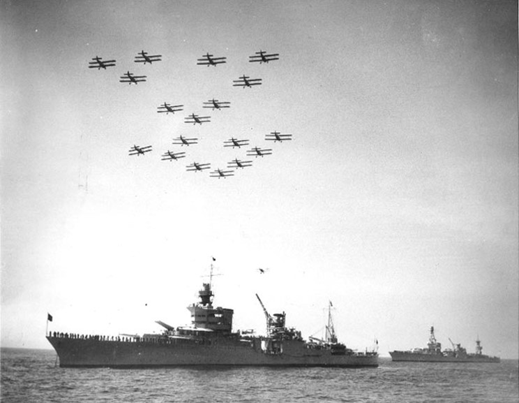 May 31, 1934: USS Indianapolis CA-35, with President Franklin D. Roosevelt embarked and USS Louisville CA 28 watch as a group of torpedo bombers fly overhead during the Fleet Review at New York. |