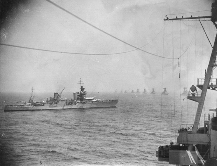May 31, 1934: Battleships of the Atlantic Fleet pass in review for President Franklin D. Roosevelt on board the USS Indianapolis CA-35. |