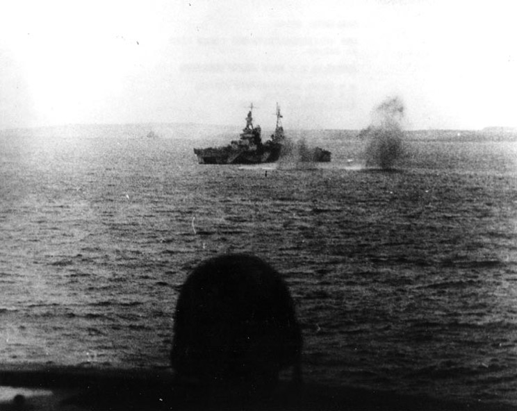 June 1944: USS Indianapolis CA-35 seen under fire from Japanese shore batteries off Saipan. |
