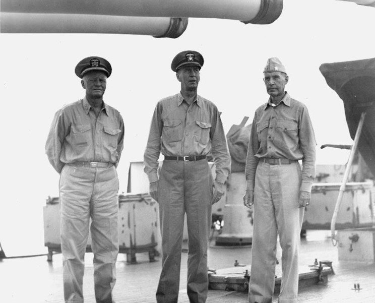 July 18, 1944: From left to right: Admiral Chester W. Nimitz, Commander-in-Chief, Pacific Fleet, Admiral Ernest J. King, Commander-in-Chief, U.S. Fleet and Admiral Raymond A. Spruance, Commander, Fifth Fleet on board the USS Indianapolis CA-35. Indianapolis was at that time Flagship of the 5th Fleet. |