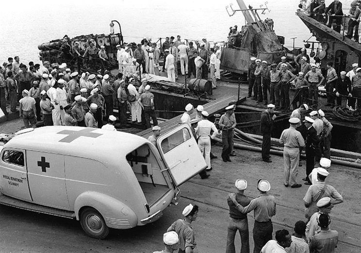 June 1942: USS Benham DD-397 seen at Pearl Harbor, Hawaii disembarking survivors from USS Hammann DD-412. |