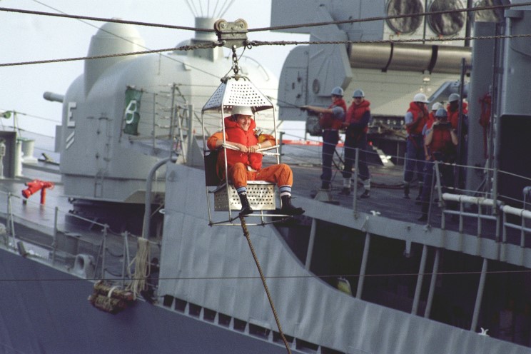 August 21, 1983: Secretary of the Navy John F. Lehman Jr. being highlined from the USS Dwight D. Eisenhower