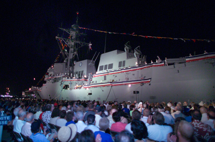 June 9, 2007: Sailors man the rails bringing the ship to life at the commissioning ceremony for the USS Kidd DDG-100. |