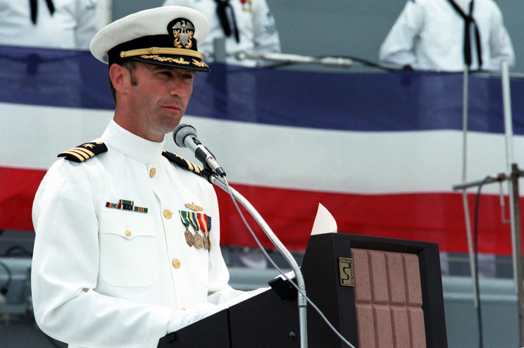 May 18, 1985: Commander R. W. Moore, commanding officer of USS Elrod FFG-55 speaking at the commissioning ceremony at Brunswick, Georgia.