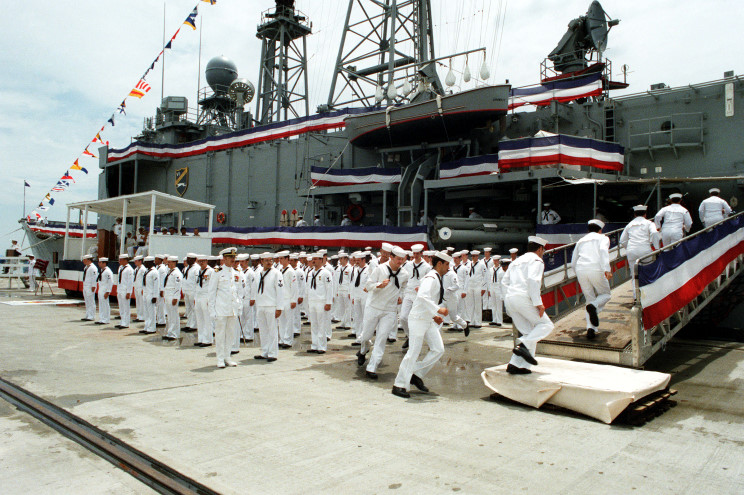May 18, 1985: Crewmen man the ship at the commissioning ceremony for the USS Elrod FFG-55.