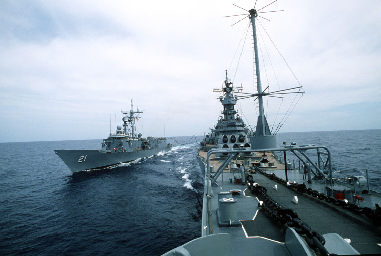 August 1984: USS Flatley FFG-21 being refueled by the USS Iowa BB-61.