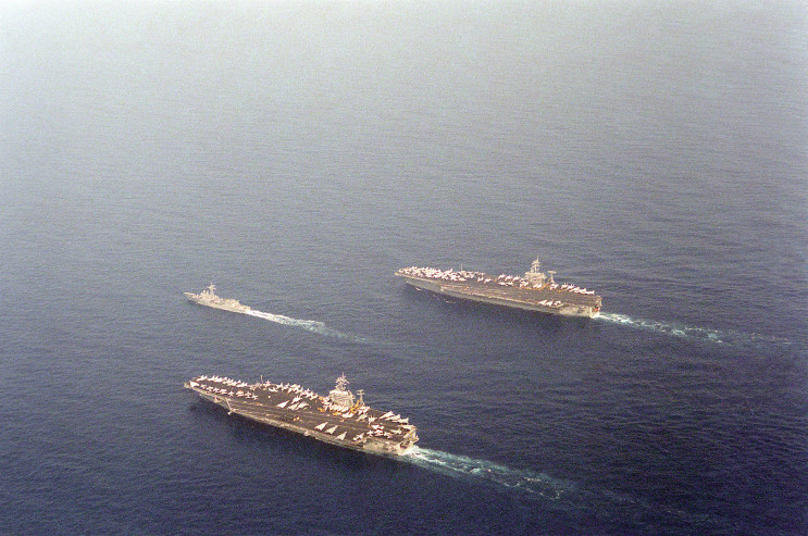 April 1, 1985: USS Flatley FFG-21 leads the USS Nimitz CVN-68 (bottom) and USS Dwight D. Eisenhower
