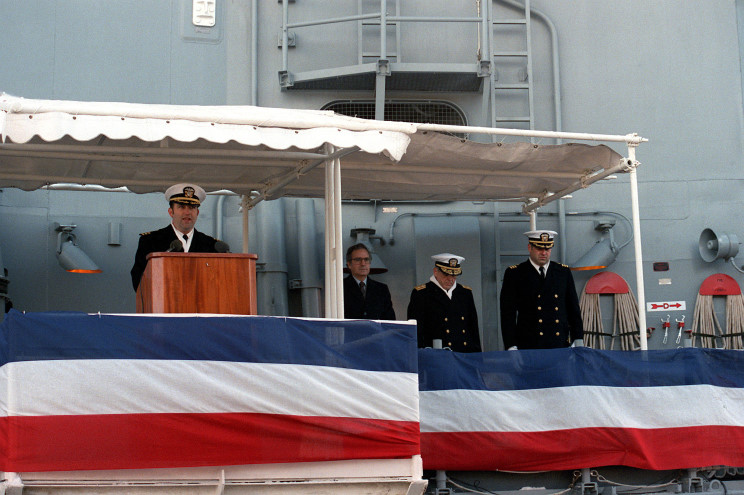 February 9, 1985: Commander Charles E. Bourke gives the invocation at the commissioning ceremony. |