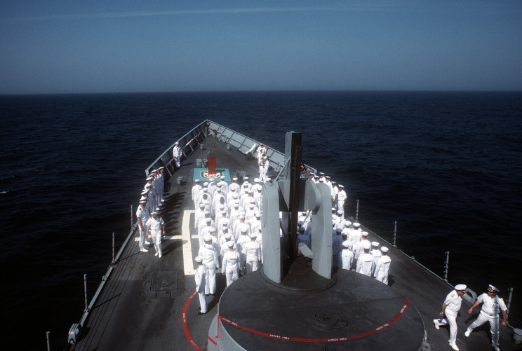 March 22, 1991: An awards ceremony aboard the USS Nicholas FFG-47 upon returning from Operation Desert Shield. Commander Naval Operations Admiral Frank B. Kelso II and commanding officer Commander Dennis G. Morral can be seen leaving the ceremony at the bottom right.