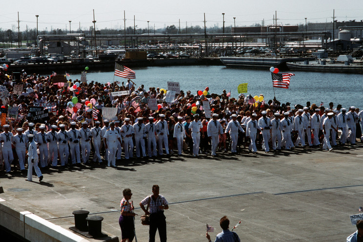 March 22, 1991: Family members await the return of the USS Nicholas FFG-47 at Naval Station Norfolk, Virginia.